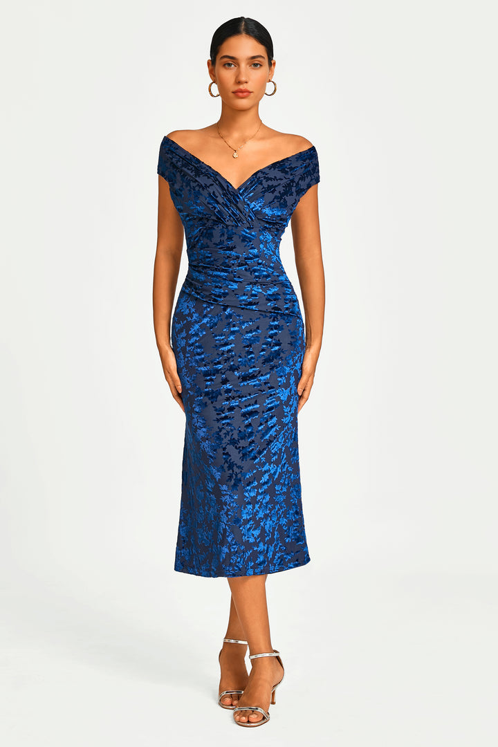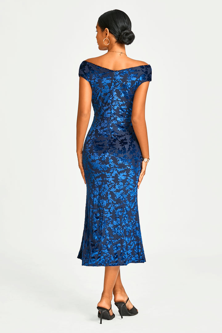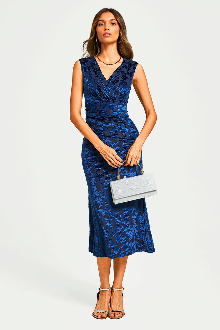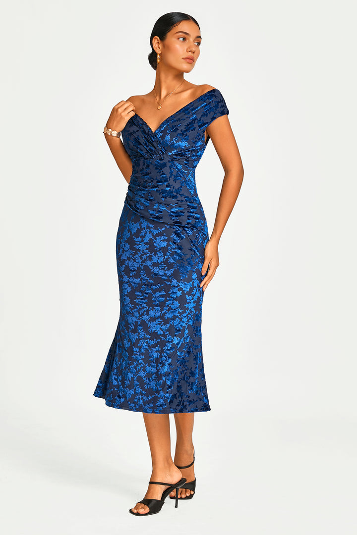 Elevate your evening wardrobe with this Floral Velvet Devore Bardot Pleated Midi Dress in Navy. Crafted from a luxurious devoré velvet fabric, this sleeveless midi dress features an elegant wrap-style pleated bodice and a soft A-line hem that drapes beautifully. The striking floral burnout pattern in rich navy and cobalt blue adds texture and depth, making it perfect for special occasions, cocktail parties, or formal events. The flattering silhouette hugs the figure while offering movement and grace, and the concealed back zip ensures a seamless fit. Style it with metallic heels and statement earrings for a timeless, sophisticated look.