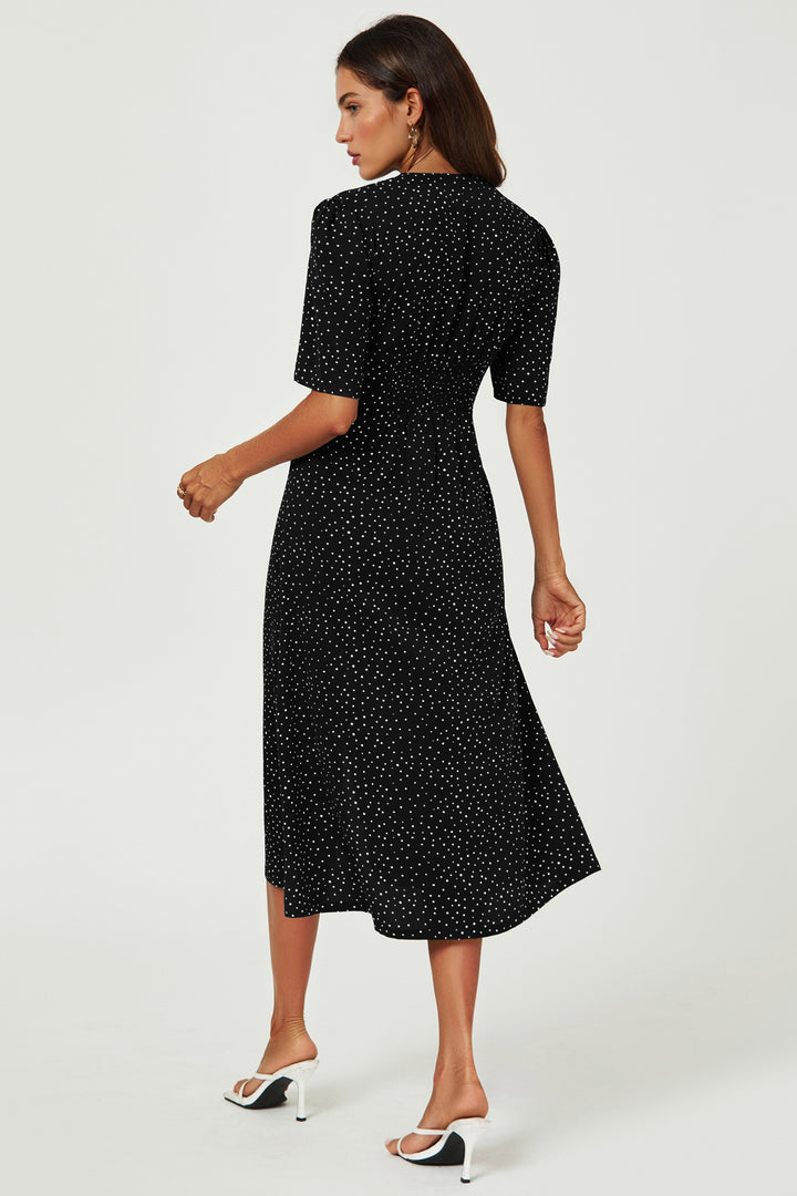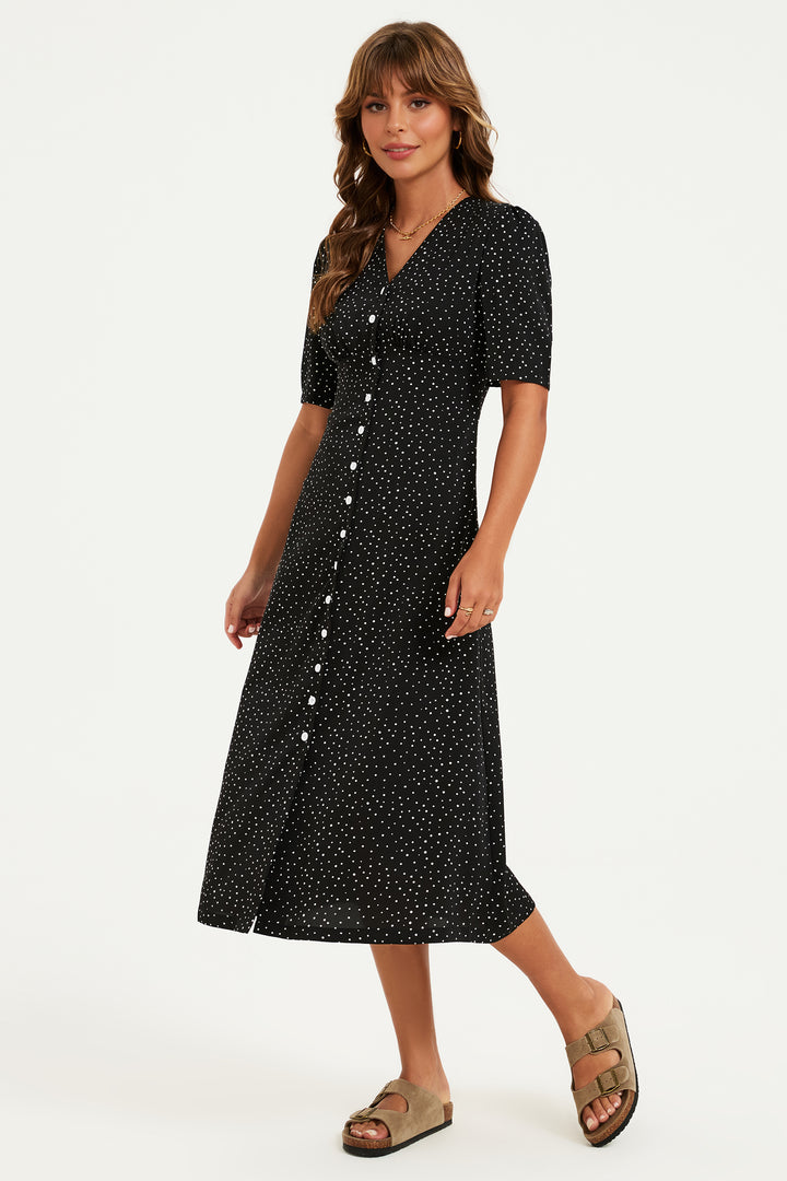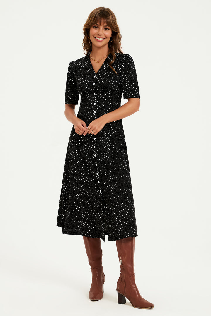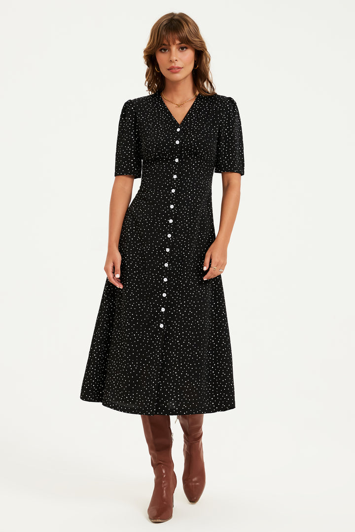 Dot Print Button Front Midi Dress In Black