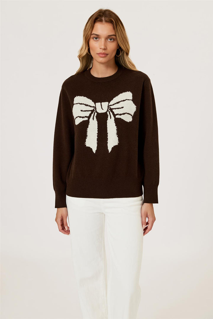Elevate your seasonal wardrobe with this charming pullover sweater, crafted from a soft and cozy wool-blend fabric. The front features a bold, oversized bow motif that adds a playful yet elegant touch to your everyday look. Designed with a classic crew neckline, relaxed silhouette, and ribbed trims at the cuffs and hem, this piece pairs effortlessly with both tailored trousers and casual denim. The rich chocolate brown hue makes it a versatile staple, perfect for layering during chilly days while keeping your style effortlessly feminine.
