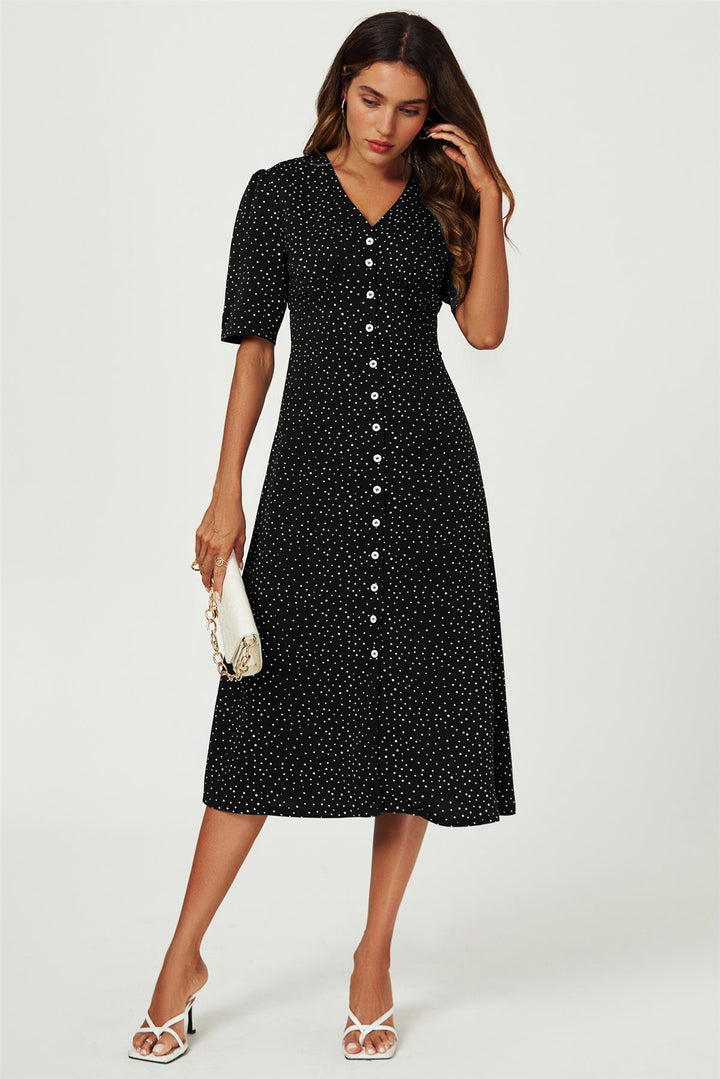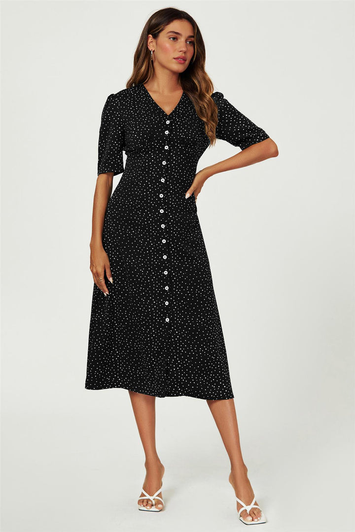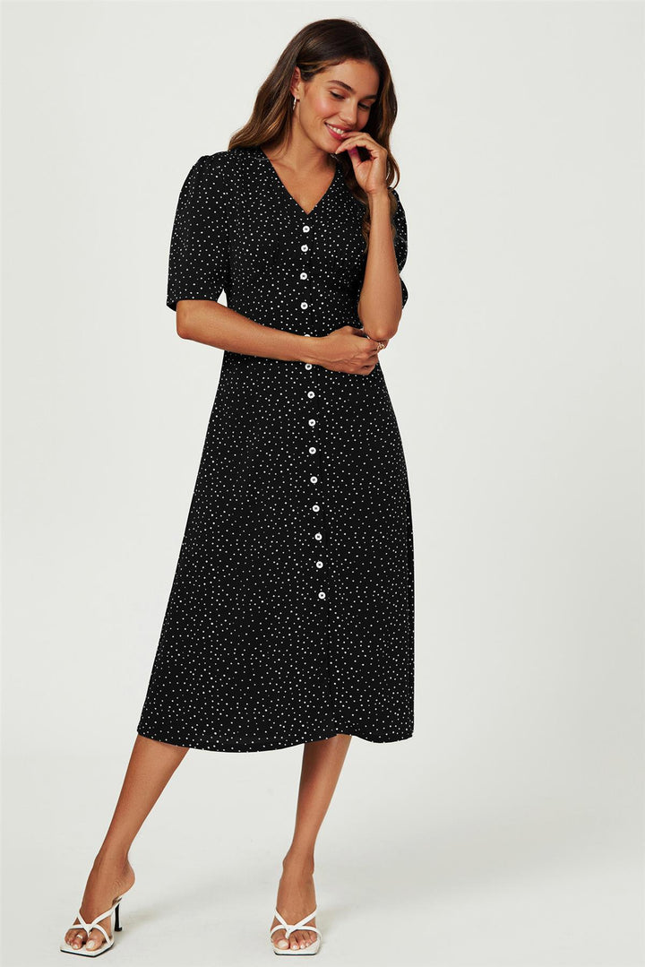 Dot Print Button Front Midi Dress In Black