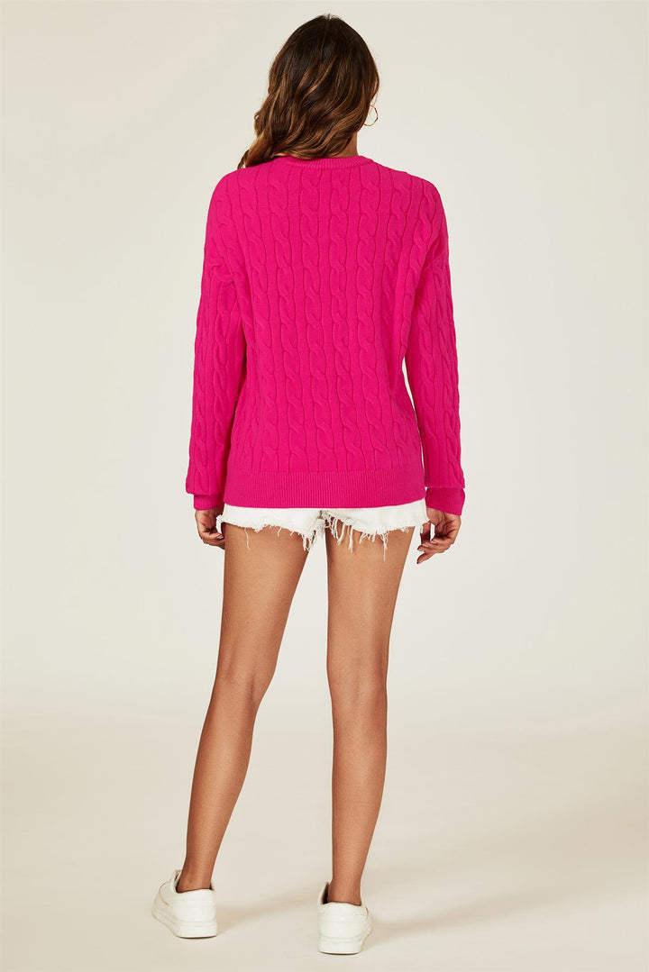 Lassen Sie sich vom skurrilen Charme unseres roten Zopfmusterpullovers mit Herzchendetail in Fuchsia verführen, einem kuscheligen Basic, das Ihrer Wintergarderobe Wärme und Stil verleiht. Das Zopfmuster sorgt für einen klassischen strukturierten Look, während die verspielten Herzchendetail für einen Hauch von Süße sorgen. Der satte Rotton verleiht Ihrem Ensemble Lebendigkeit und macht es zu einem Hingucker in den kälteren Monaten. Mit seiner lockeren Passform und dem bequemen Tragegefühl ist dieser Pullover perfekt für kühle Tage und bietet sowohl Komfort als auch ein wunderbares Modestatement. Werten Sie Ihren Winterstyle mit dem herzerwärmenden Reiz dieses roten Zopfmusterpullovers mit Herzchendetail auf, ein Must-have für alle, die eine Mischung aus Komfort und verspielter Eleganz suchen.