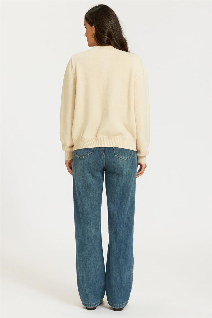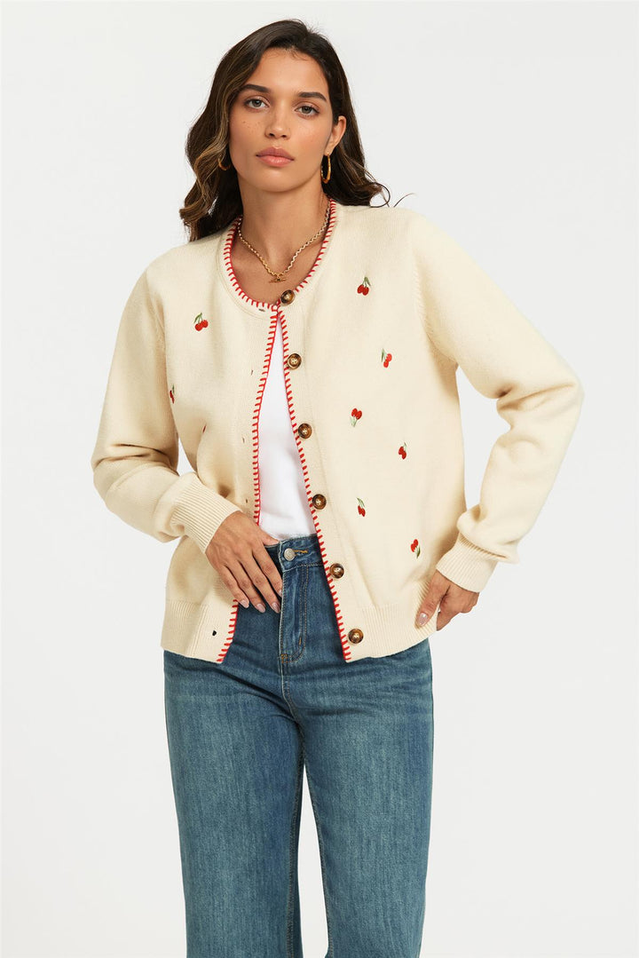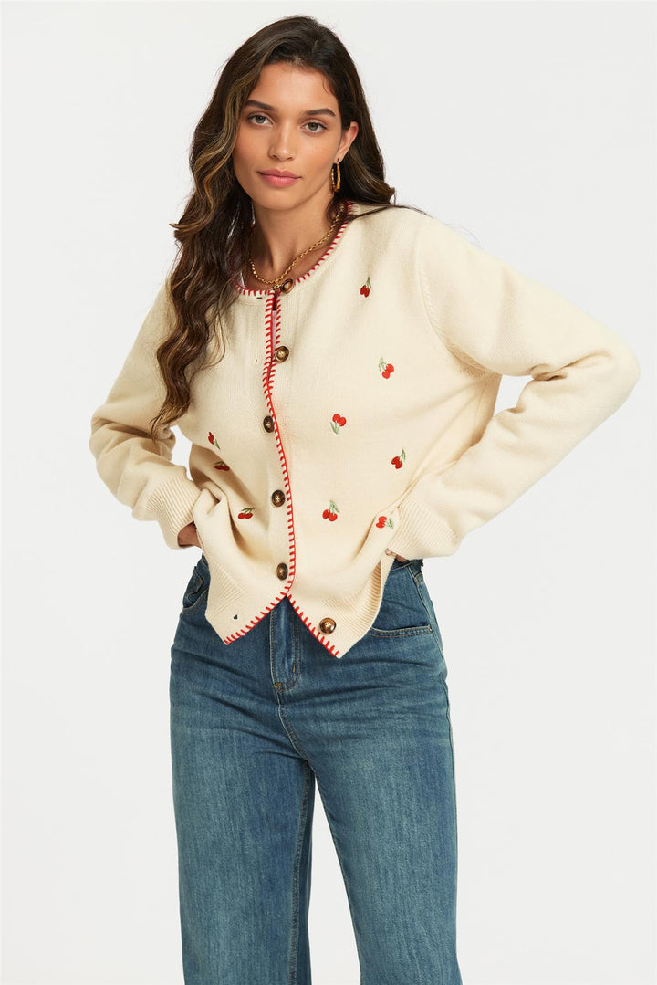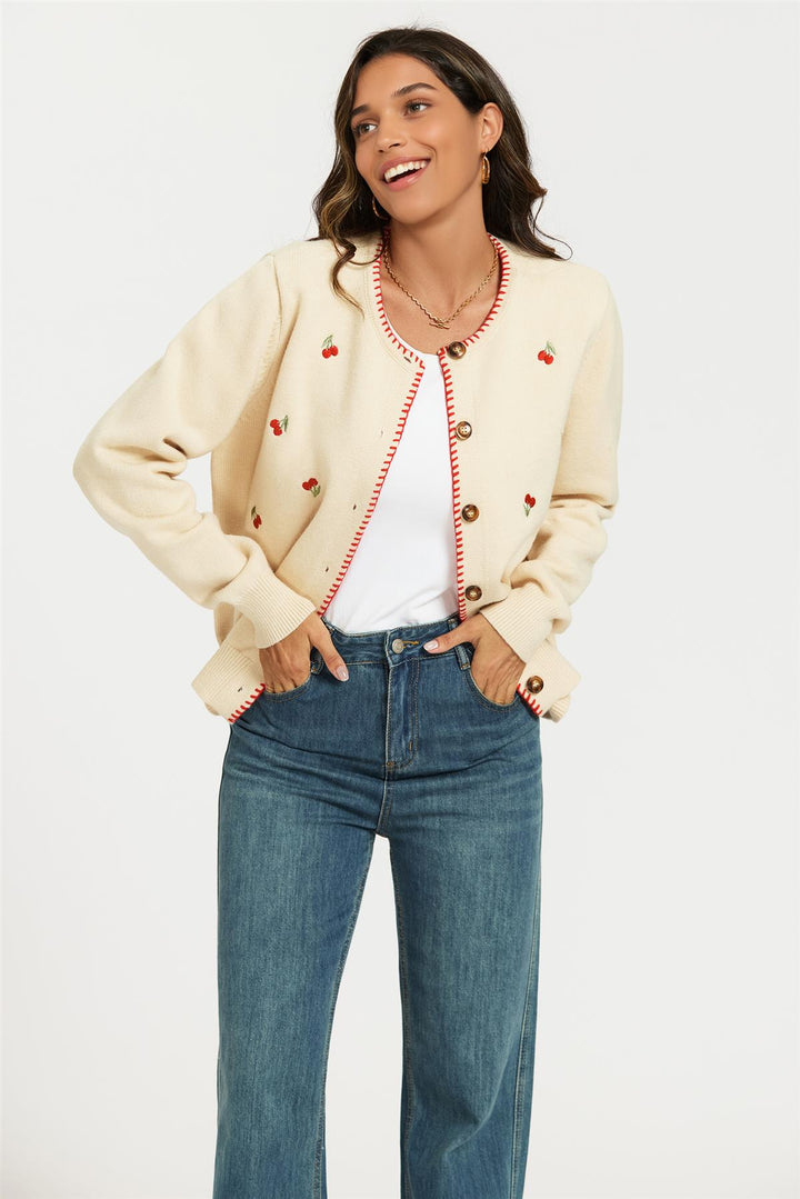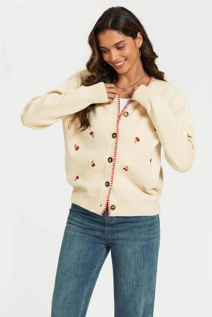 Playful yet timeless, this wool-blend cardigan features charming all-over cherry embroidery that adds a touch of whimsy to your everyday wardrobe. The classic crew neckline and front button closure are elevated with contrast red hand-stitched trim, giving it a crafted, boutique feel. Made for layering or wearing on its own, this piece blends softness with style for a look that's both cozy and eye-catching.