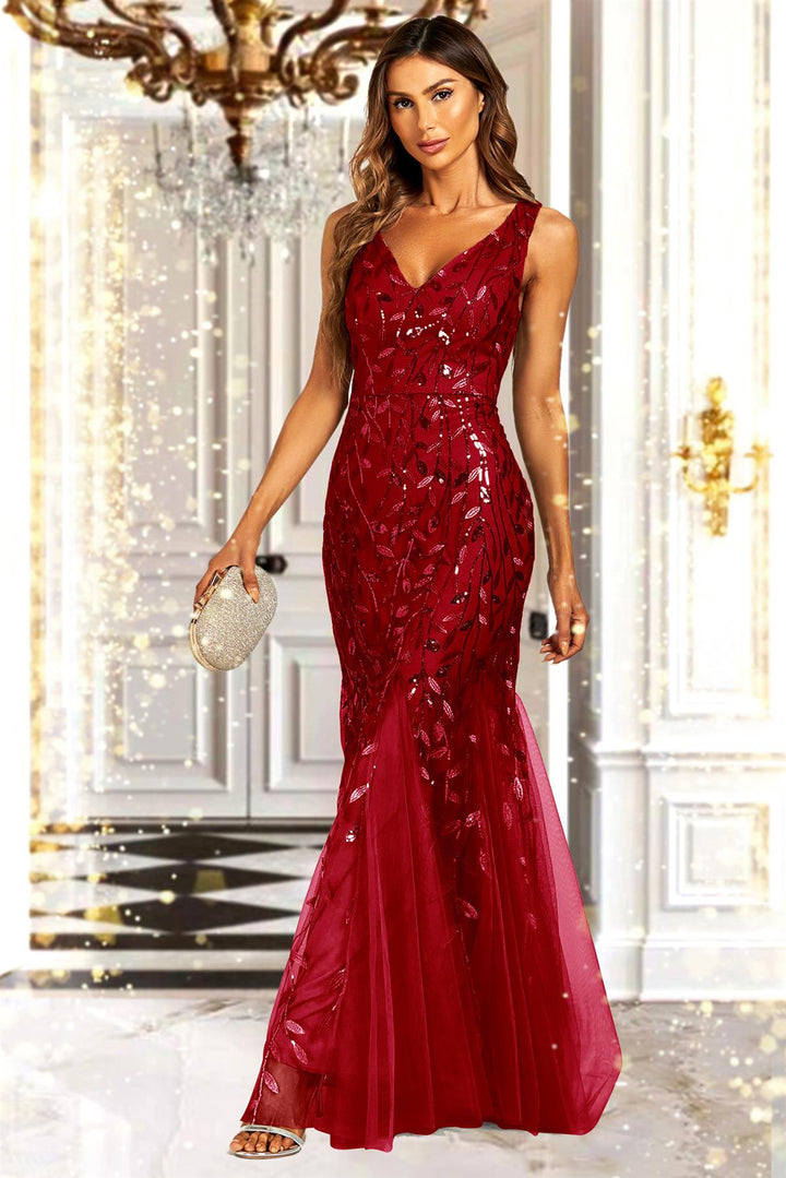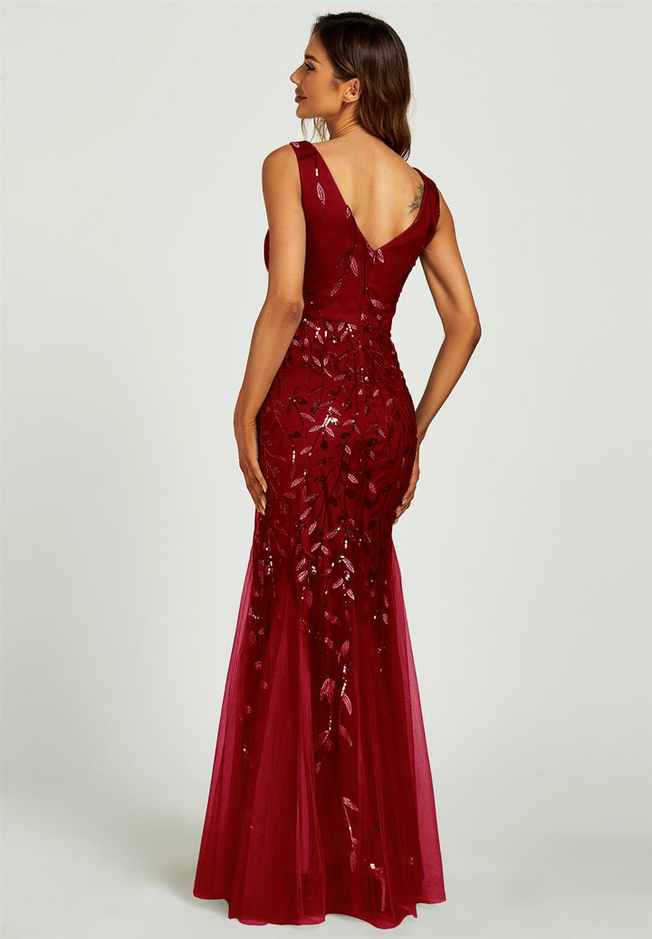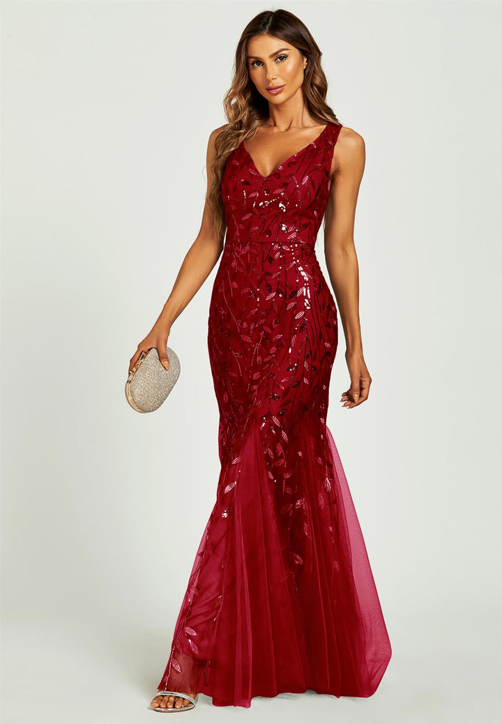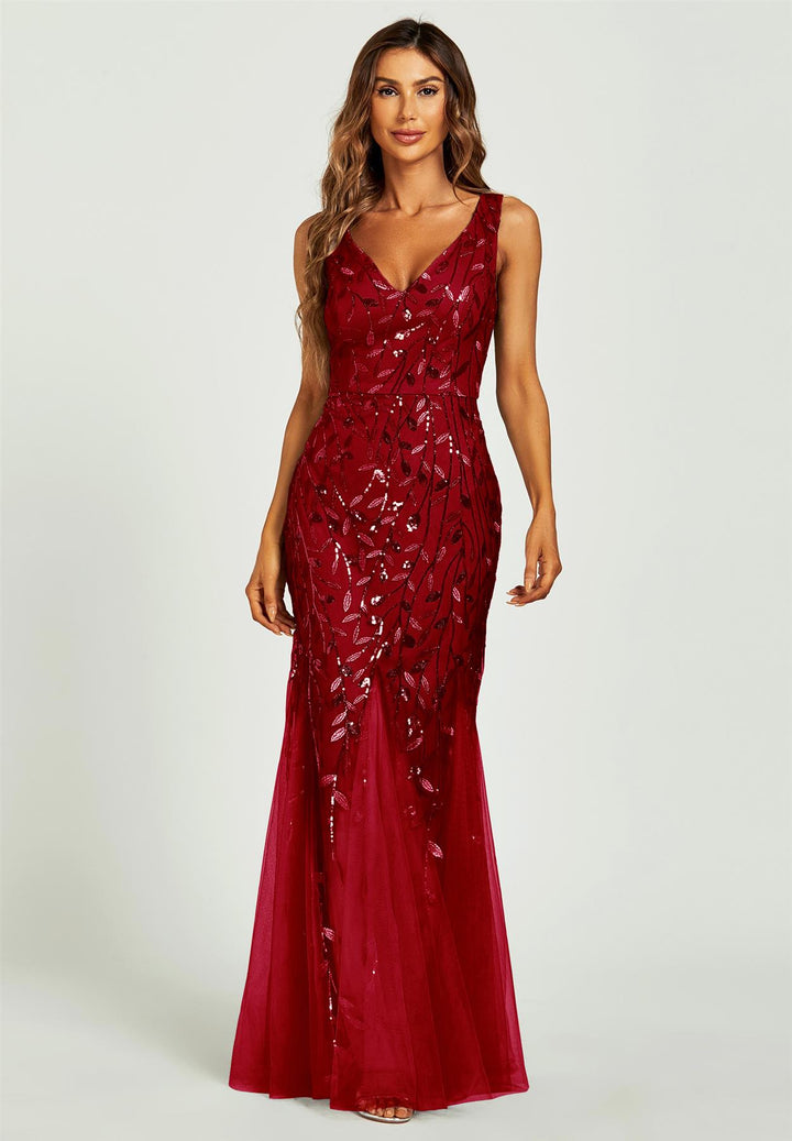 Introducing our Floor-Hitting Length V-Neck Sequin Leaf Embroidered Occasion Dress, a dazzling masterpiece designed to make you shine like a star at your most special events. The standout feature of this dress is the exquisite sequin leaf embroidery. Each leaf is meticulously crafted to catch the light, creating a mesmerizing sparkle that will turn heads wherever you go. The embroidery adds a touch of nature-inspired charm and whimsy to the overall design. The flattering V-neckline beautifully frames your décolletage, adding a touch of allure and sophistication. It allows you to showcase your favourite jewelry or accessories, enhancing the overall elegance of the dress. Pair this occasion dress with your favorite heels and statement accessories to complete your red carpet-worthy look.