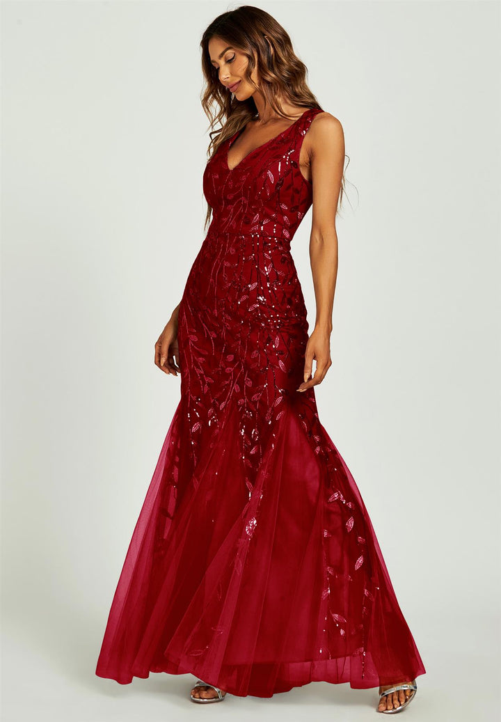 Sequin Leaf Detailed V Neck Bridesmaid Maxi Dress In Wine