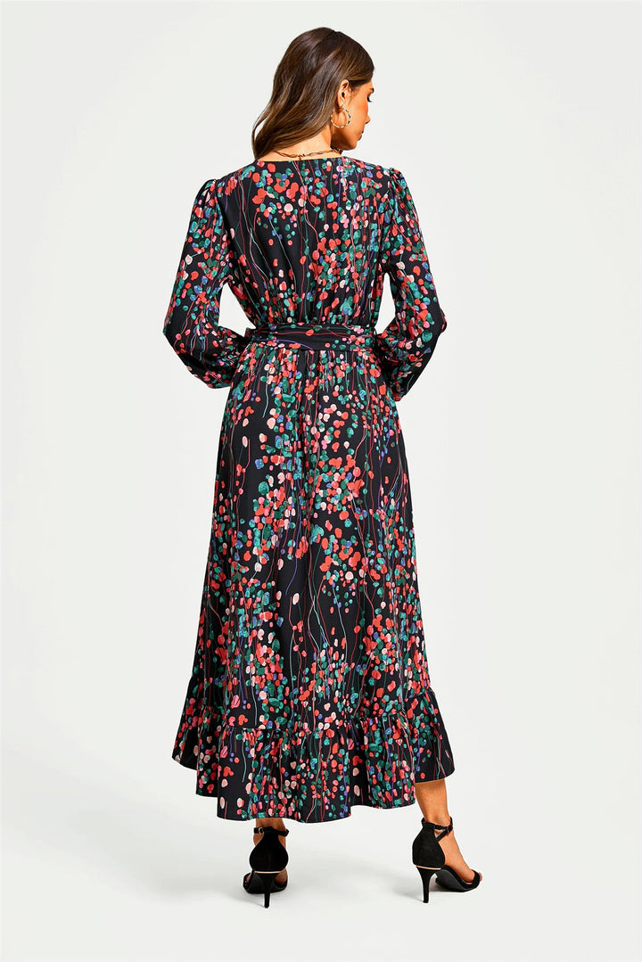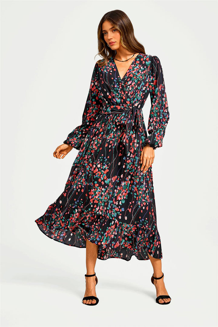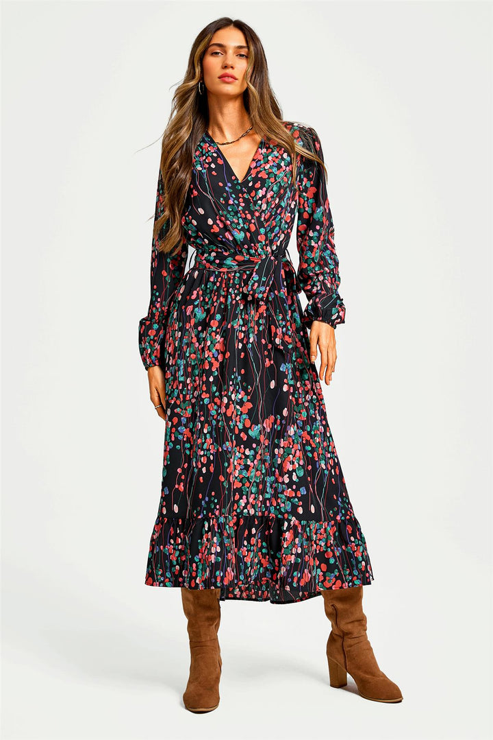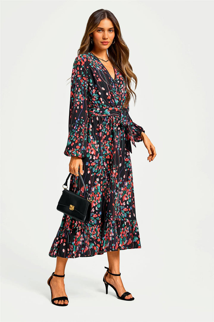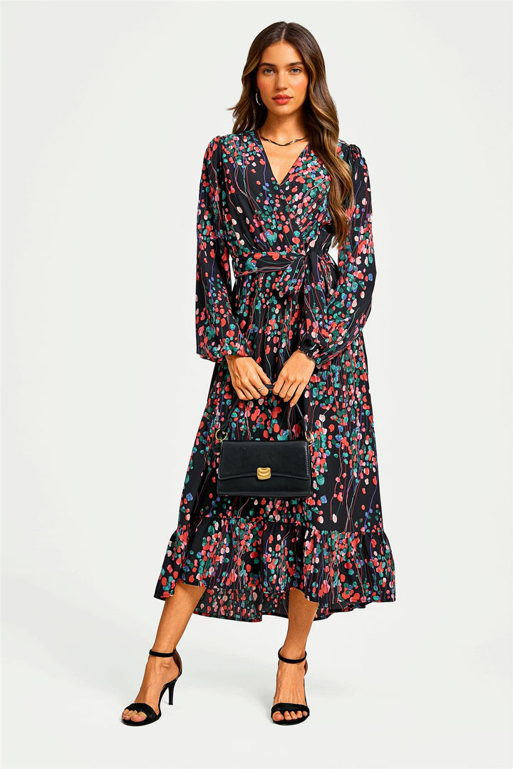 Step into the season with elegance in this Abstract Floral Print Long Sleeve Midi Dress. Crafted from a soft, flowy fabric, this dress features a flattering V-neckline and a wrap-style bodice that ties at the waist to accentuate your silhouette. The abstract floral print in vibrant shades of red, green, and soft pastels pops against the black base, creating a playful yet sophisticated look. The long sleeves with subtle volume and gathered cuffs add a touch of romantic charm, while the tiered hemline gives the dress graceful movement. Perfect for both casual daytime outings and evening dinners, this dress pairs beautifully with boots or heels for a versatile wardrobe staple.