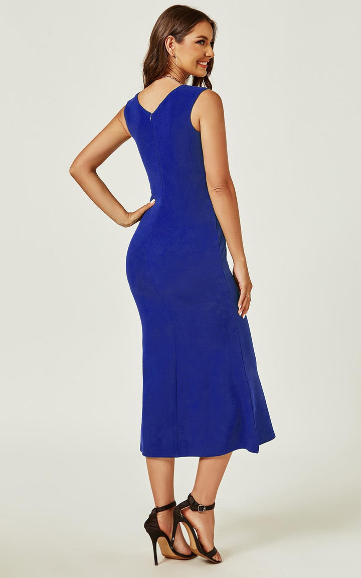 Turn heads in this figure-enhancing royal blue midi dress, designed to exude timeless elegance and effortless confidence. The dress features a sophisticated off-the-shoulder neckline with a flattering crossover bodice that accentuates the décolletage, while subtle draping along the waist creates a beautifully sculpted silhouette. Crafted from a smooth, stretchy fabric that hugs the body in all the right places, it flares gently below the knee for a sleek and balanced finish. The back zip closure ensures a secure fit, and the sleeveless design offers modern femininity. Perfect for date nights, weddings, or cocktail parties—just add heels and a clutch to complete the look.