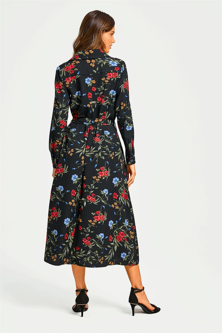Black Floral Print Shirt Midi Dress With Tie Waist + Gold Stretch Leaf Belt
