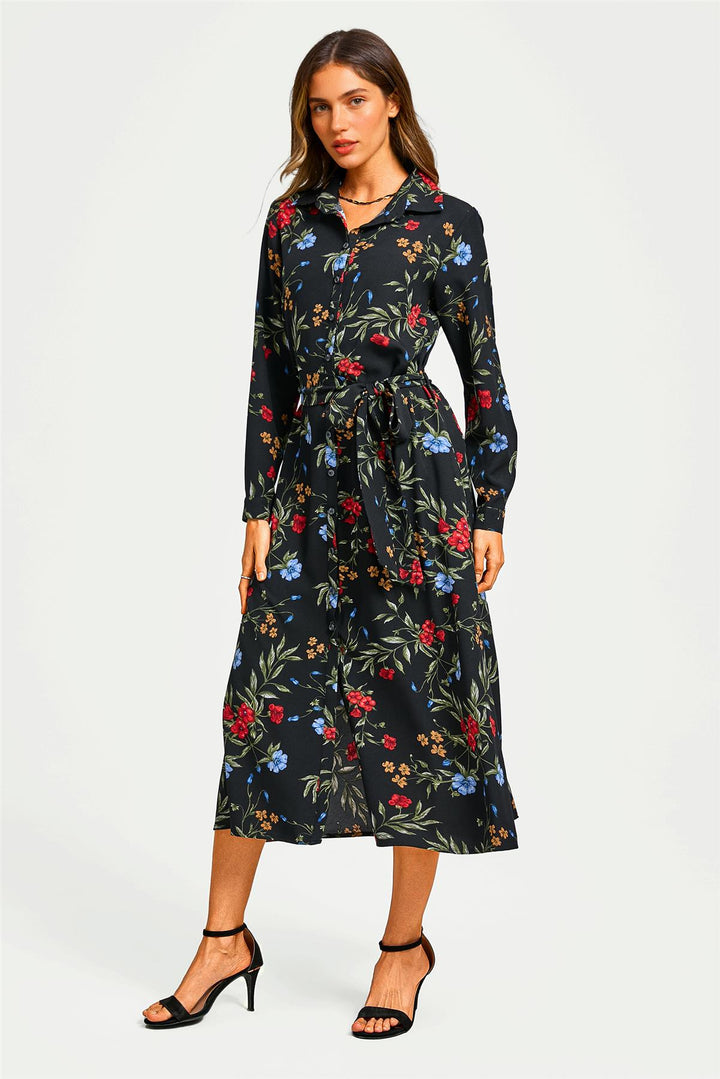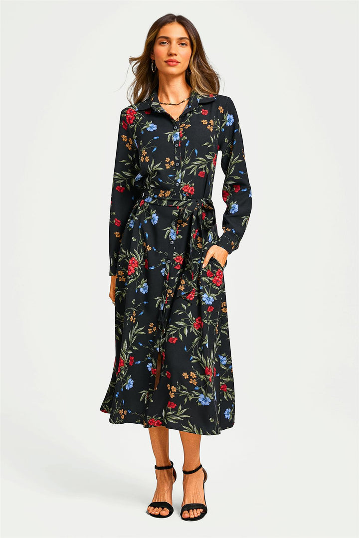 Elevate your everyday style with this Black Floral Print Shirt Midi Dress, complete with a flattering tie waist and a chic gold stretch leaf belt. The classic shirt silhouette paired with a bold floral print creates an effortlessly elegant look, while the belt adds the perfect touch of glamour. Ideal for both daytime outings and evening events.