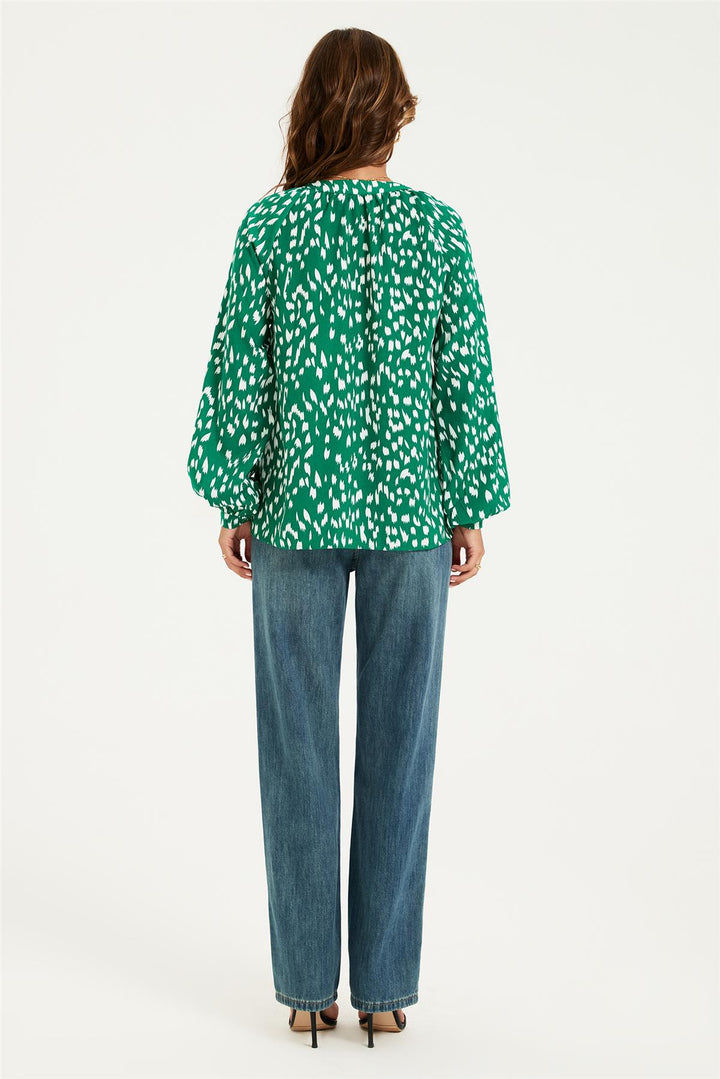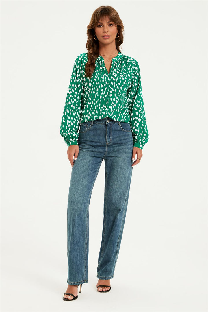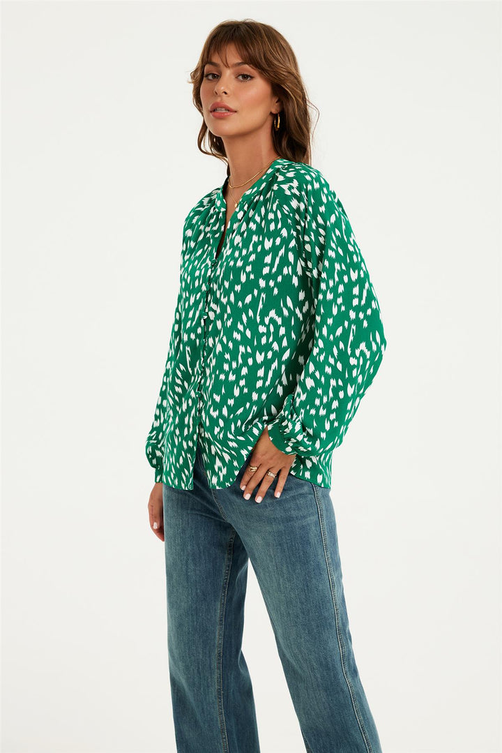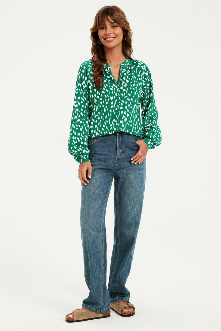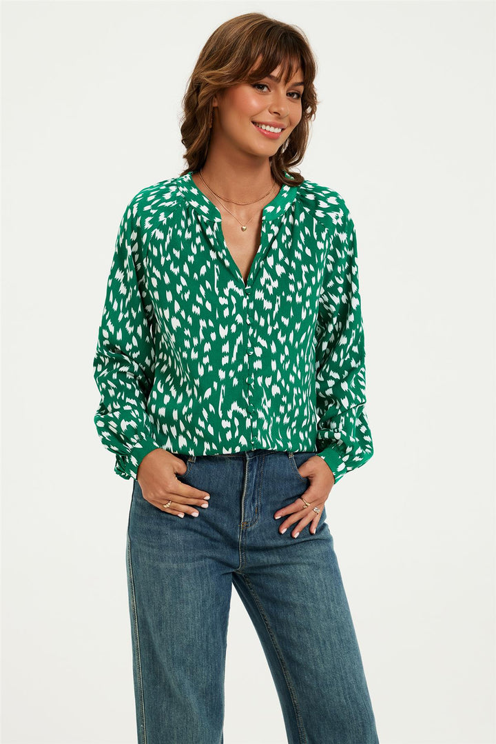Brushstroke Print long sleeve Blouse Top In Green