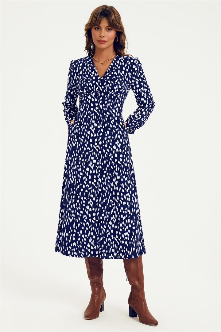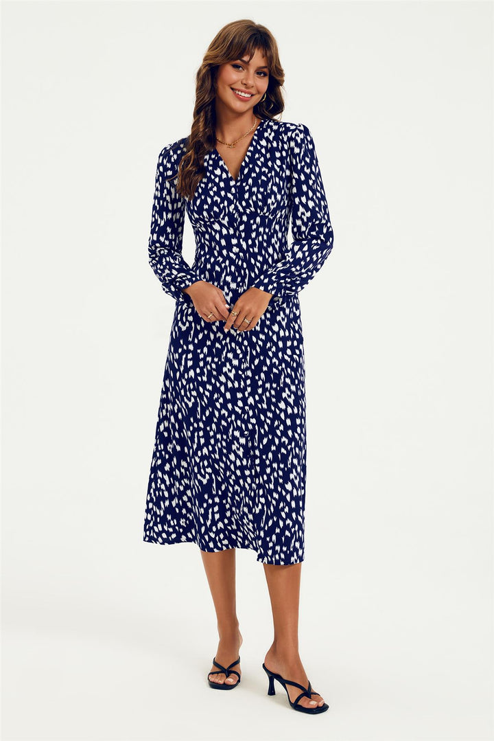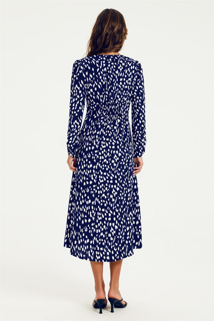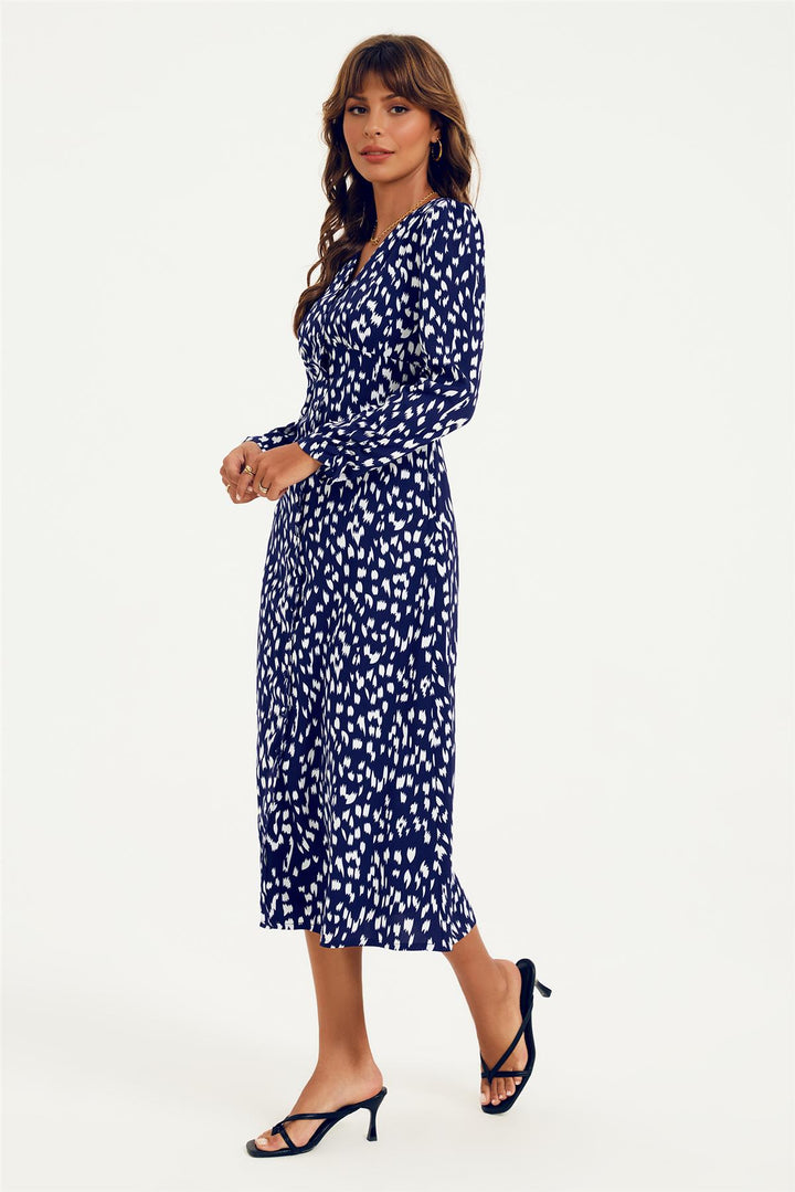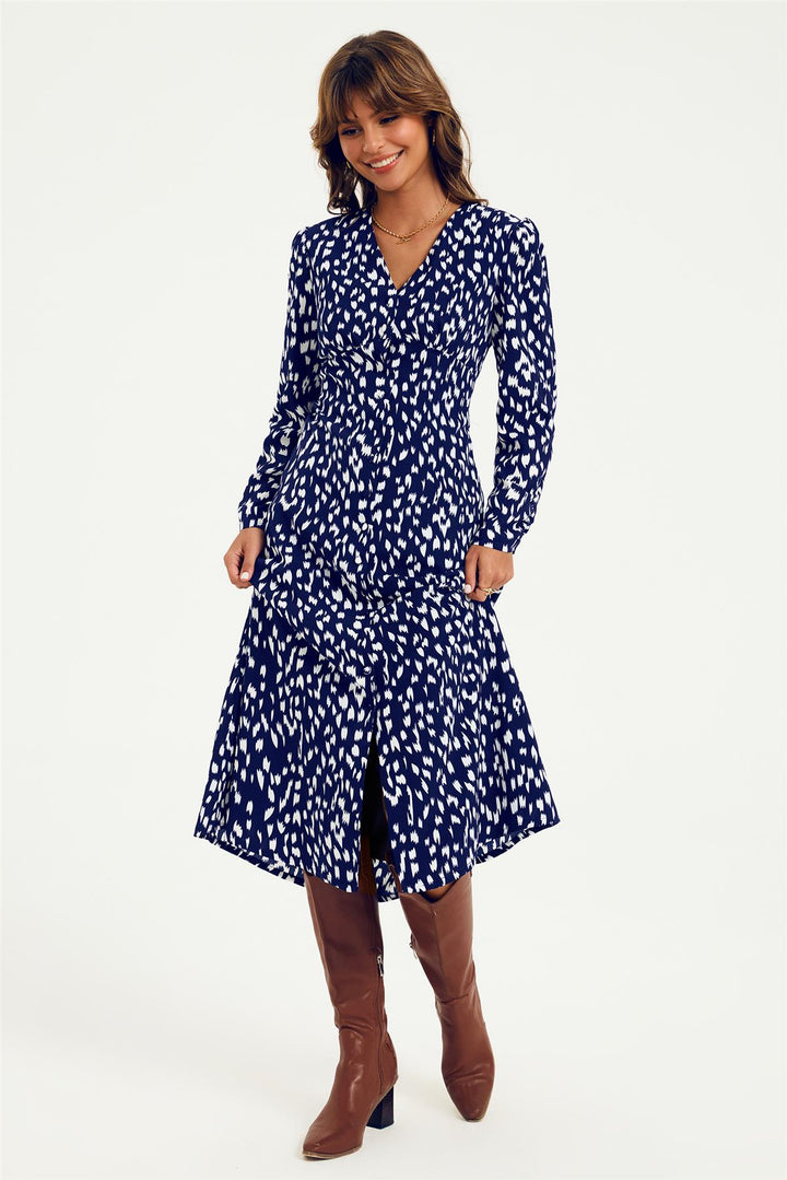 Turn heads effortlessly in this flattering navy midi dress, adorned with an all-over white abstract print. Crafted from a soft, flowing fabric, it features a V-neckline, structured shoulders, and long ruched sleeves for a touch of sophistication. The dress gently cinches at the waist to create a beautiful hourglass silhouette, while the button-down front adds detail and versatility. Perfect for both day and evening occasions, pair it with heeled sandals or knee-high boots for an effortlessly chic look.