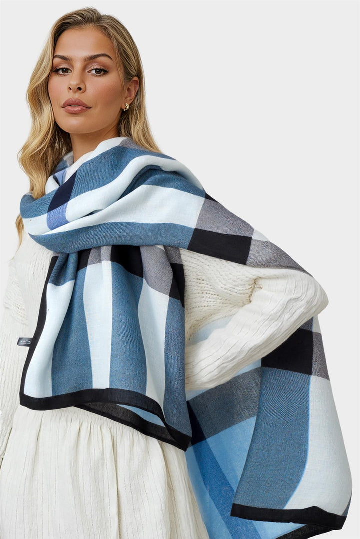 Wrap yourself in style and warmth with this elegant check print scarf. Crafted from a soft, lightweight fabric, it features a striking palette of sky blue, navy, white, and grey hues in a bold checked pattern, framed with a contrasting black border for a polished finish. Generously sized for versatile styling, this scarf can be worn draped over the shoulders as a shawl or wrapped snugly around the neck for added warmth. Perfect for transitional seasons or chilly days, it effortlessly elevates both casual and dressed-up looks. Whether you're layering it over a cozy knit or pairing it with a lightweight dress, this scarf brings a refined yet relaxed vibe to your outfit.