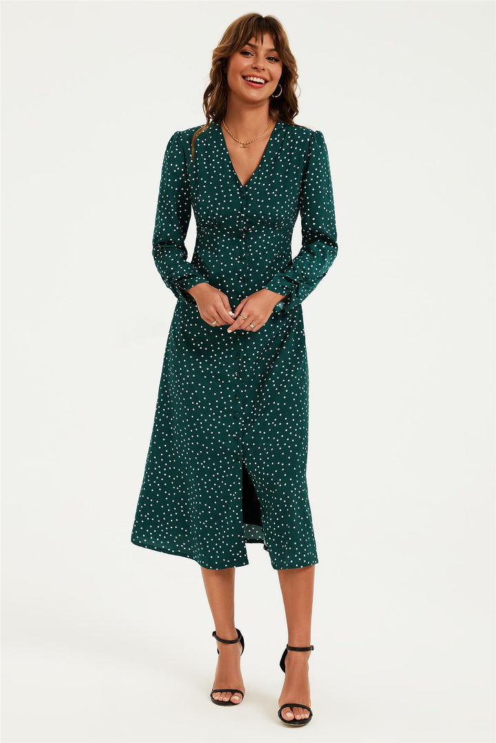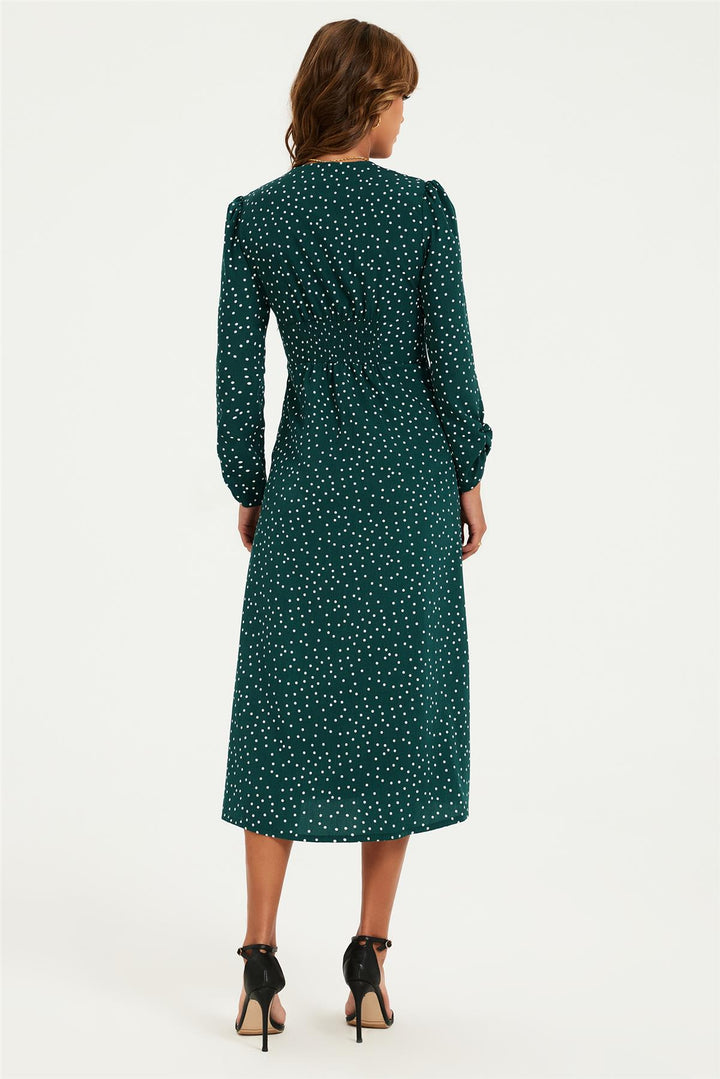 Timelessly elegant with a playful twist, this green midi dress is adorned with delicate white polka dots for a classic yet charming look. Designed with a flattering V-neckline and subtle gathered detailing at the bust, it features long sleeves with buttoned cuffs and softly puffed shoulders for a feminine silhouette. The fitted waist enhances your shape, while the slightly flared hem adds graceful movement. Style it with sandals for a relaxed daytime look or dress it up with boots and a jacket for cooler seasons.