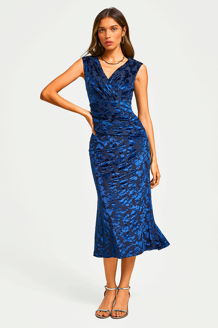 Elevate your evening wardrobe with this Floral Velvet Devore Bardot Pleated Midi Dress in Navy. Crafted from a luxurious devoré velvet fabric, this sleeveless midi dress features an elegant wrap-style pleated bodice and a soft A-line hem that drapes beautifully. The striking floral burnout pattern in rich navy and cobalt blue adds texture and depth, making it perfect for special occasions, cocktail parties, or formal events. The flattering silhouette hugs the figure while offering movement and grace, and the concealed back zip ensures a seamless fit. Style it with metallic heels and statement earrings for a timeless, sophisticated look.