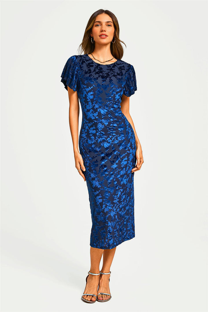 Turn heads this season in our striking Floral Velvet Devore Midi Dress—a perfect blend of elegance and modern sophistication. Crafted from luxe devoré velvet with an intricate all-over floral pattern in rich sapphire blue, this bodycon silhouette contours beautifully to your figure. The fluttery puff sleeves add a romantic touch, while the midi length keeps the look refined and versatile. Whether you're heading to a winter wedding, festive gathering, or elegant dinner, this dress offers both comfort and style with its soft stretch fabric and subtle back slit for ease of movement. Pair it with statement heels or delicate jewellery to complete the look.
