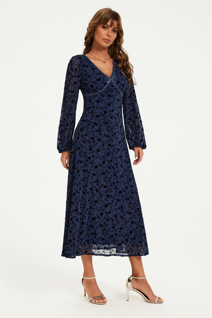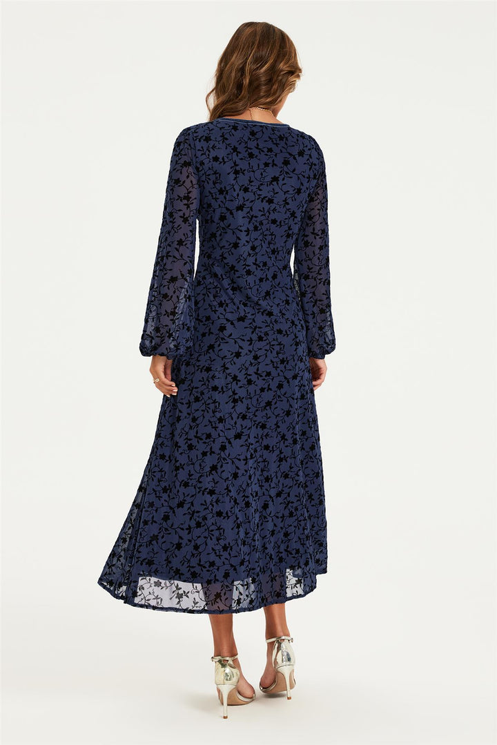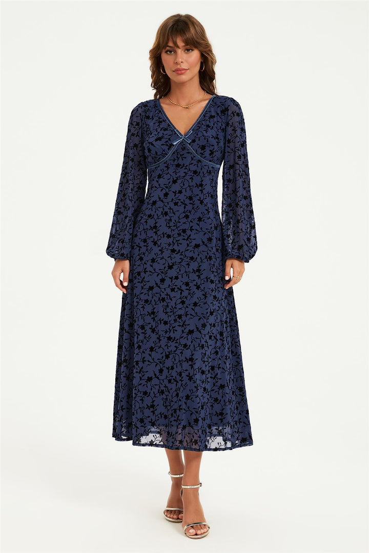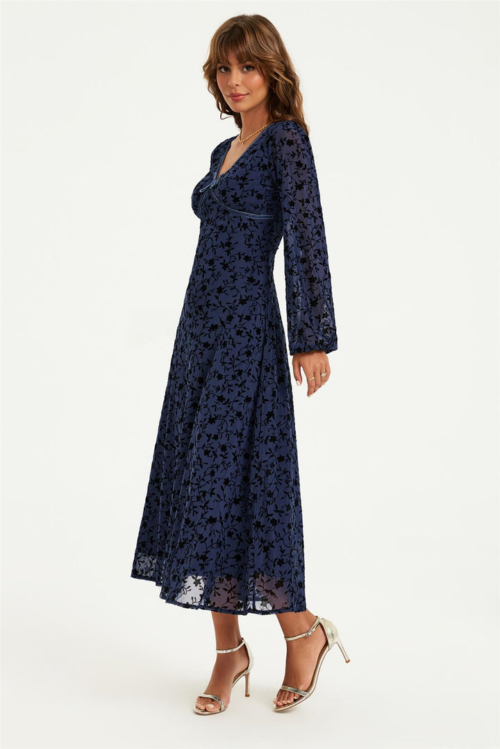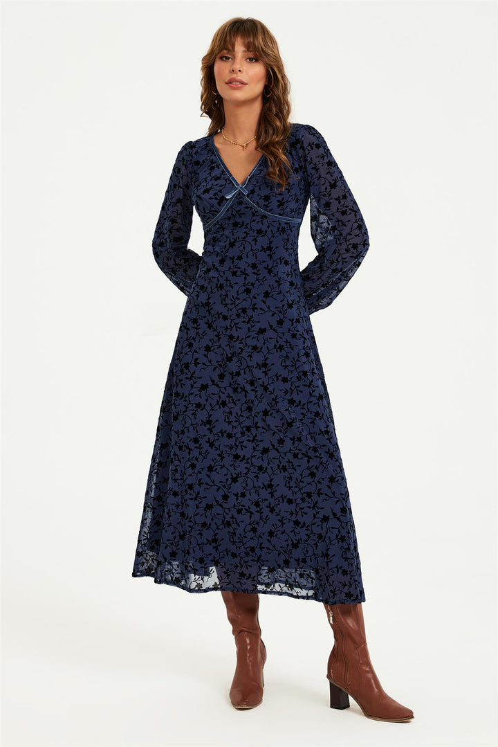 Floral Velvet Devore V Neckline Midi Dress In Navy