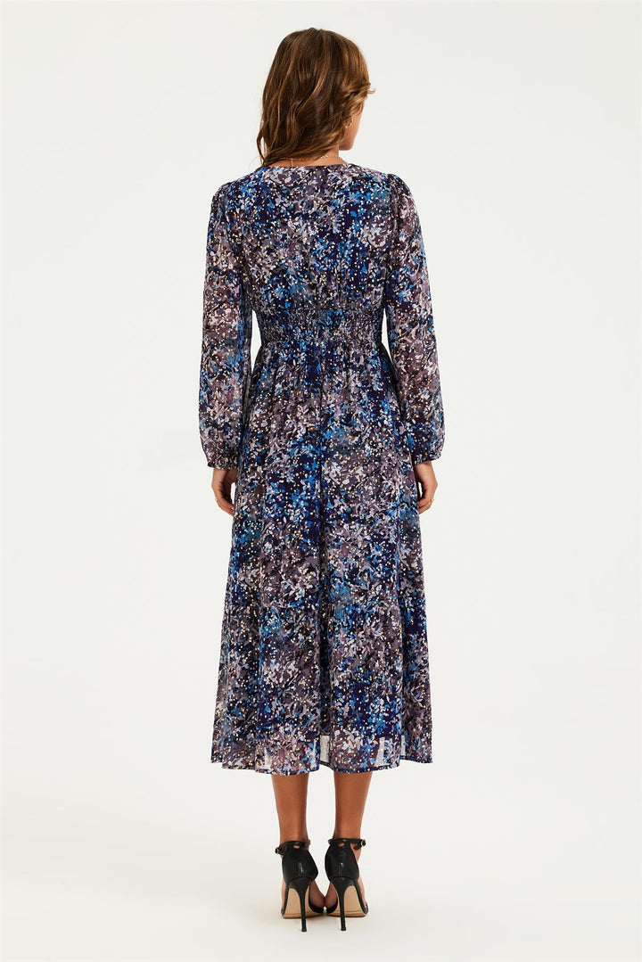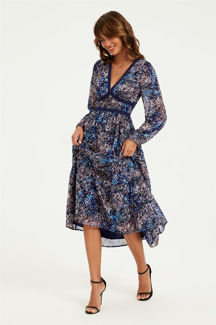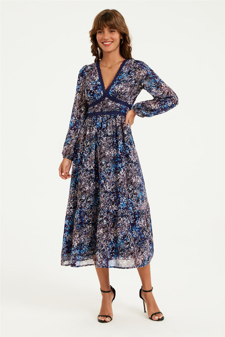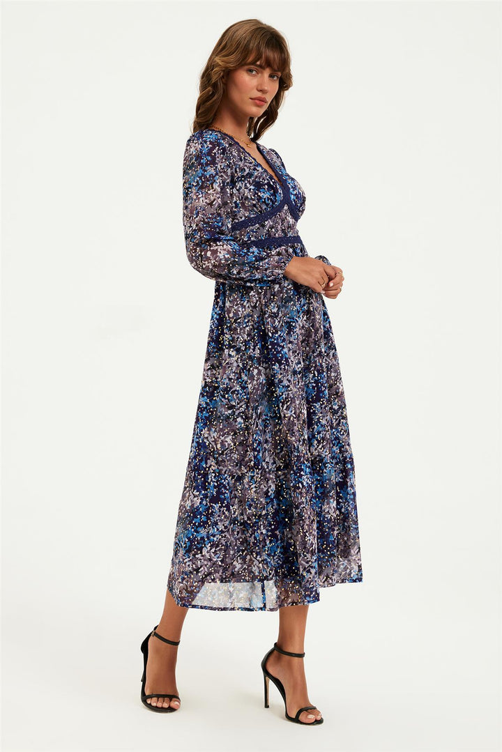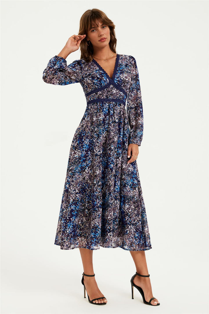 Shimmer with elegance in this captivating foil-print floral maxi dress. Designed in a flattering fit-and-flare silhouette, this dress features a deep V-neckline framed with delicate navy lace trim that adds a touch of romantic charm. The long sleeves and softly gathered waist provide both comfort and structure, while the metallic foil accents catch the light beautifully with every movement. Crafted from a lightweight, semi-sheer chiffon with a soft lining underneath, this piece is perfect for transitioning from day to evening wear. Whether you're attending a special occasion or dressing up for a stylish dinner, this dress effortlessly blends sophistication and modern glamour.
