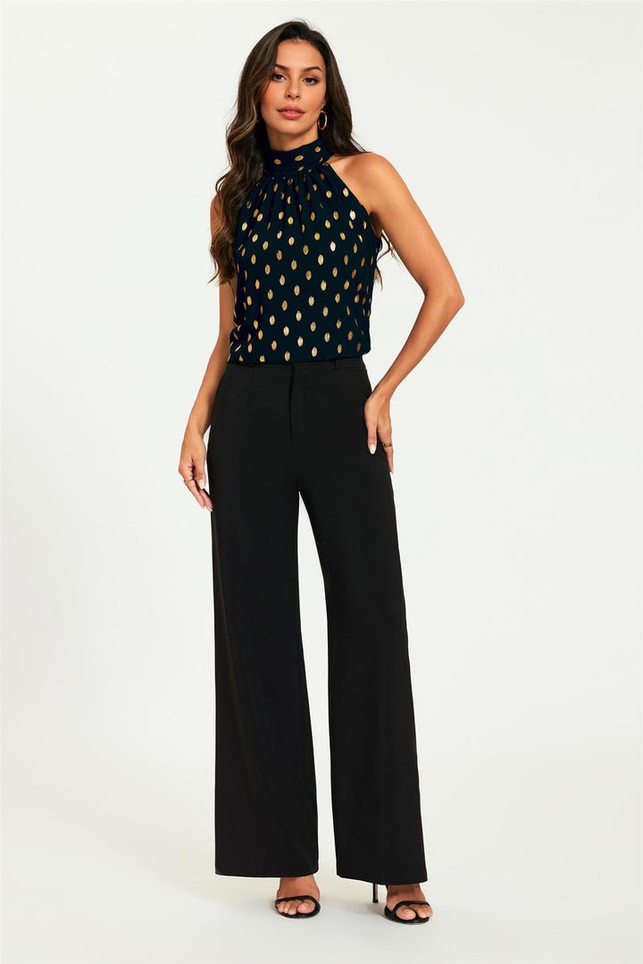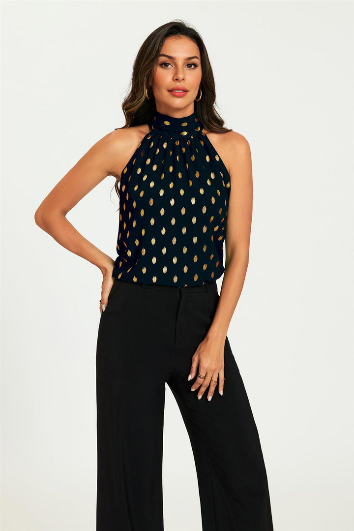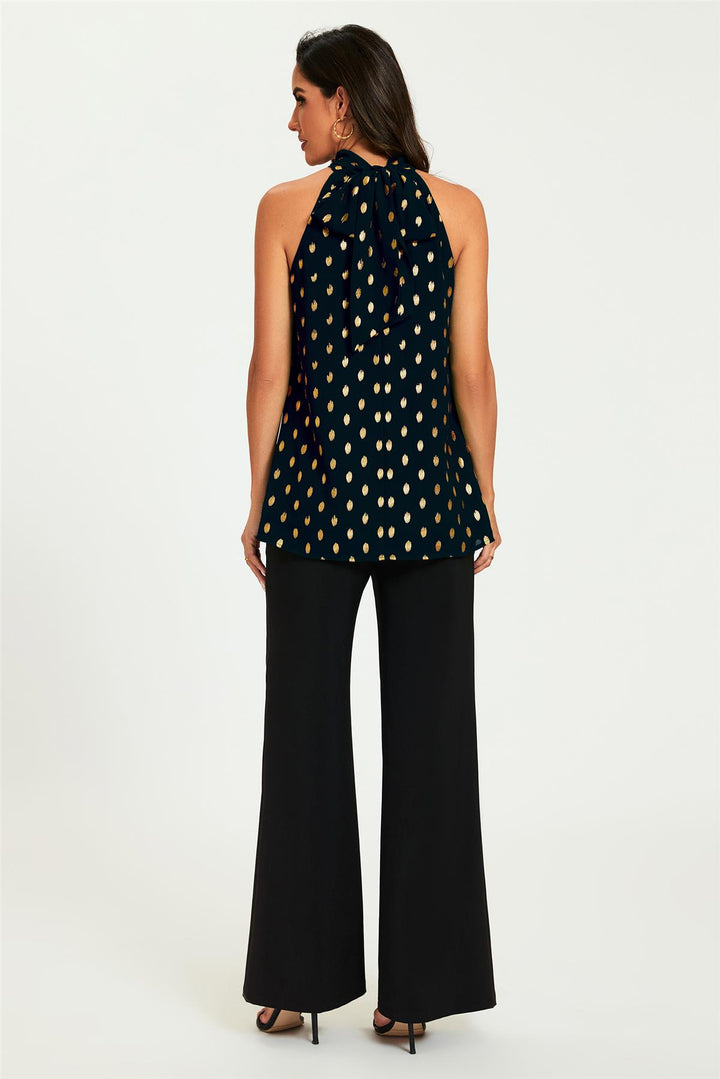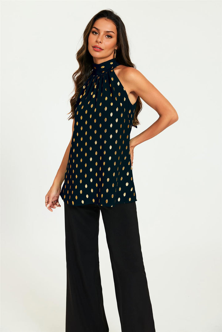 Gold Foil Halter Neck Tie Back Top In Black