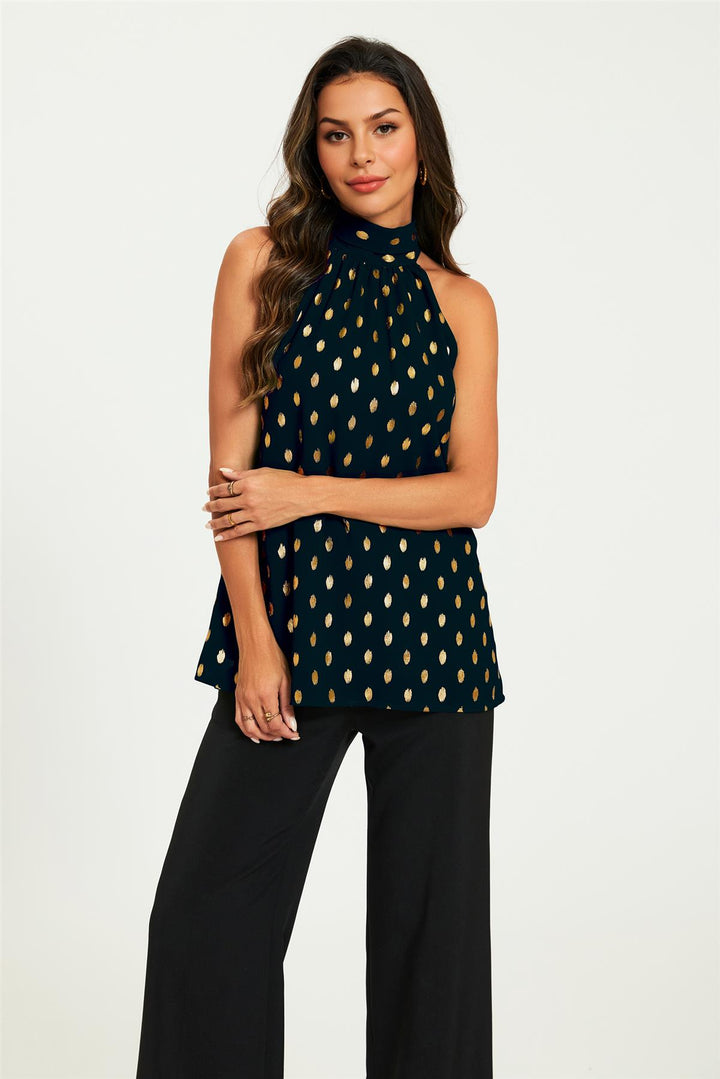 Add a touch of glamour to your wardrobe with this Gold Foil Halter Neck Tie Back Top in Black. Featuring a shimmering gold foil finish and an elegant halter neckline, this standout piece ties at the back for a flattering, adjustable fit—perfect for nights out and festive occasions.