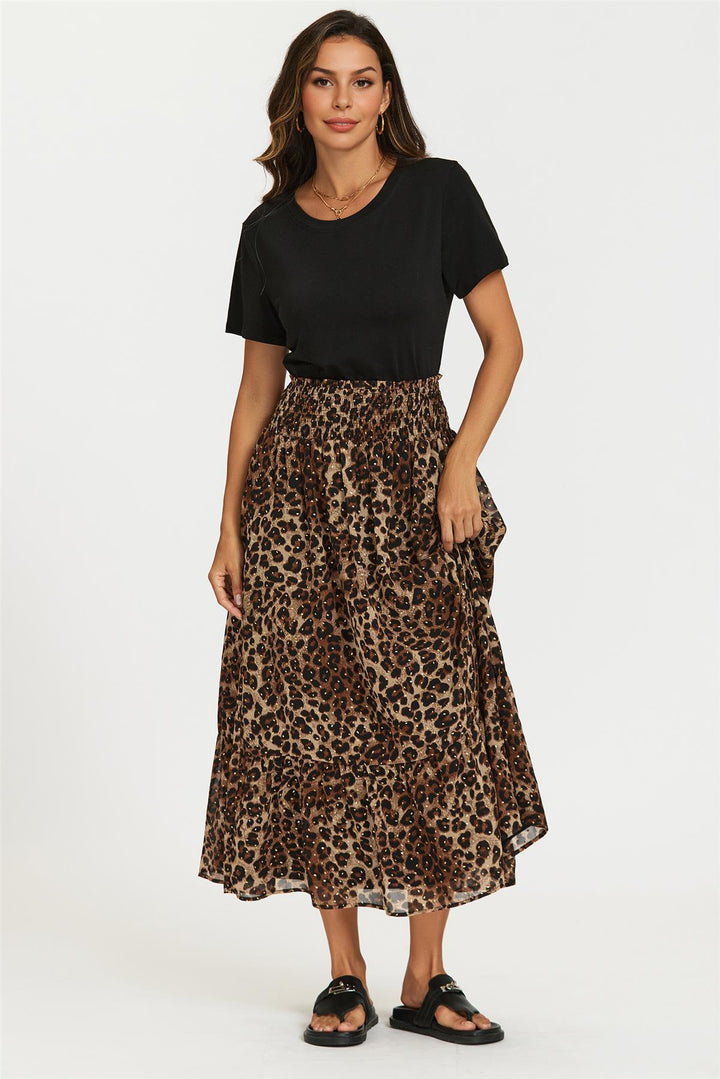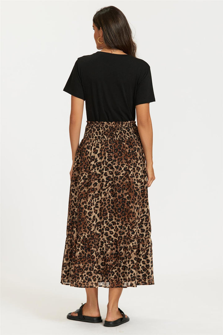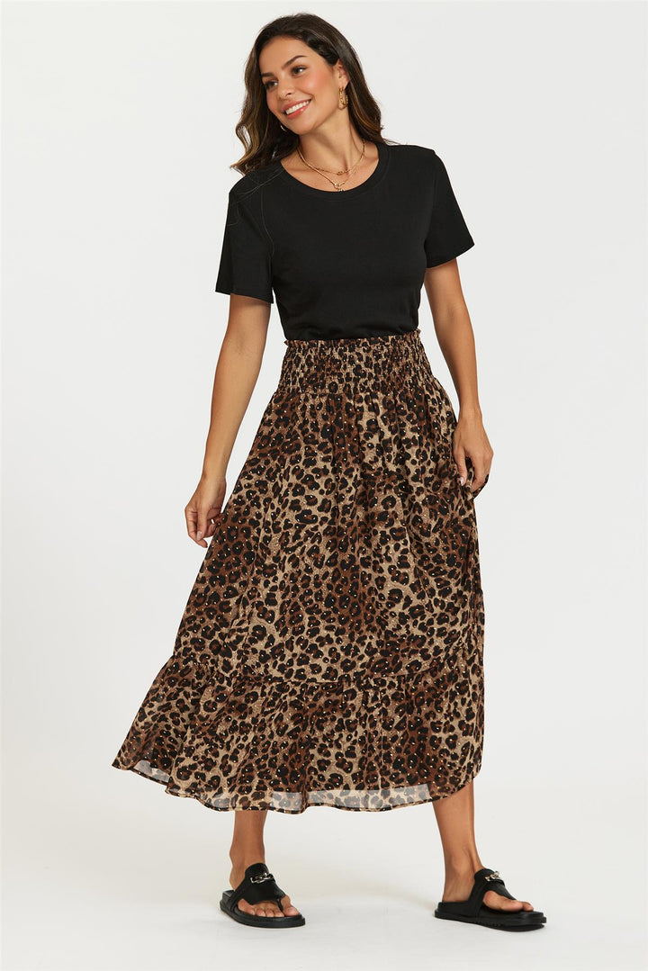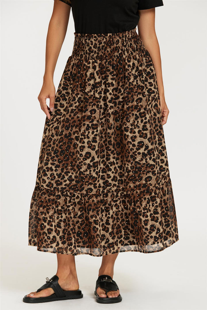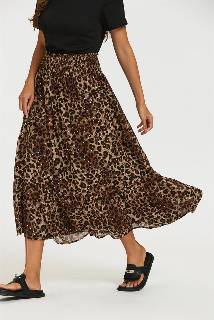 Unleash your wild side with this statement leopard print midi skirt, finished with shimmering gold foil accents for a touch of glam. Designed with a comfortable shirred high waist, it offers a flattering fit while adding effortless style to your everyday wardrobe. The flowing A-line silhouette and tiered hem bring beautiful movement with every step, making it perfect for both casual days and dressed-up evenings. Pair it with a simple tee or chunky knit for versatile looks all year round.