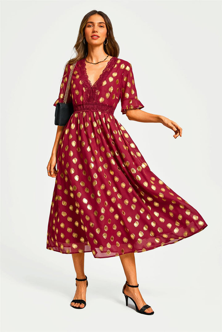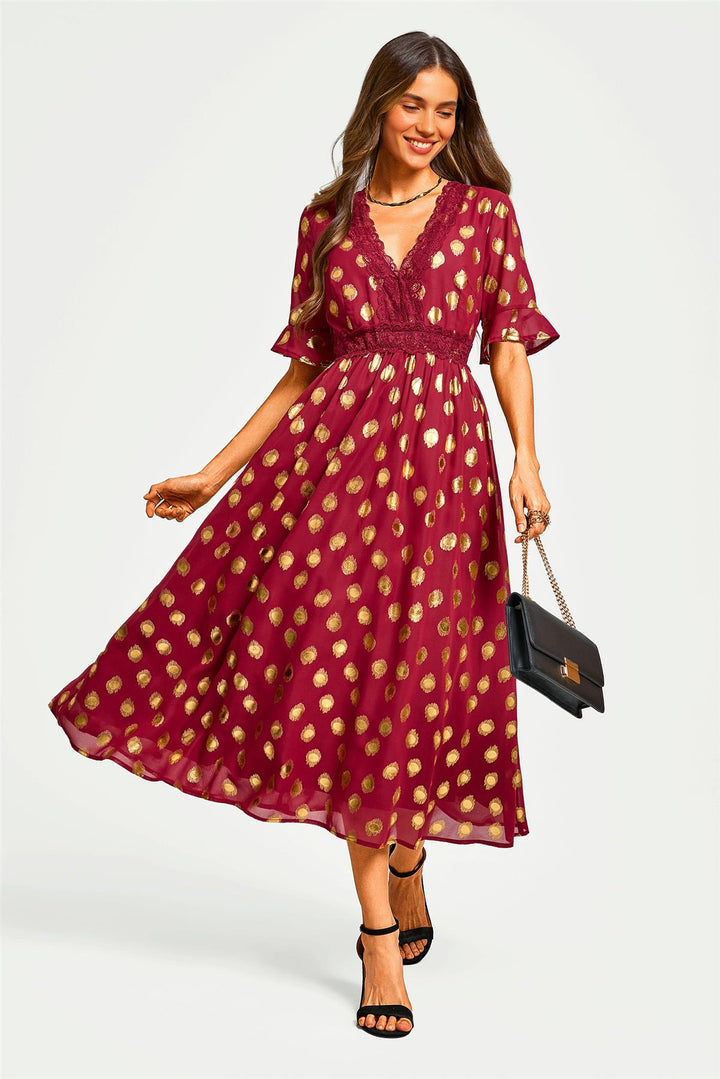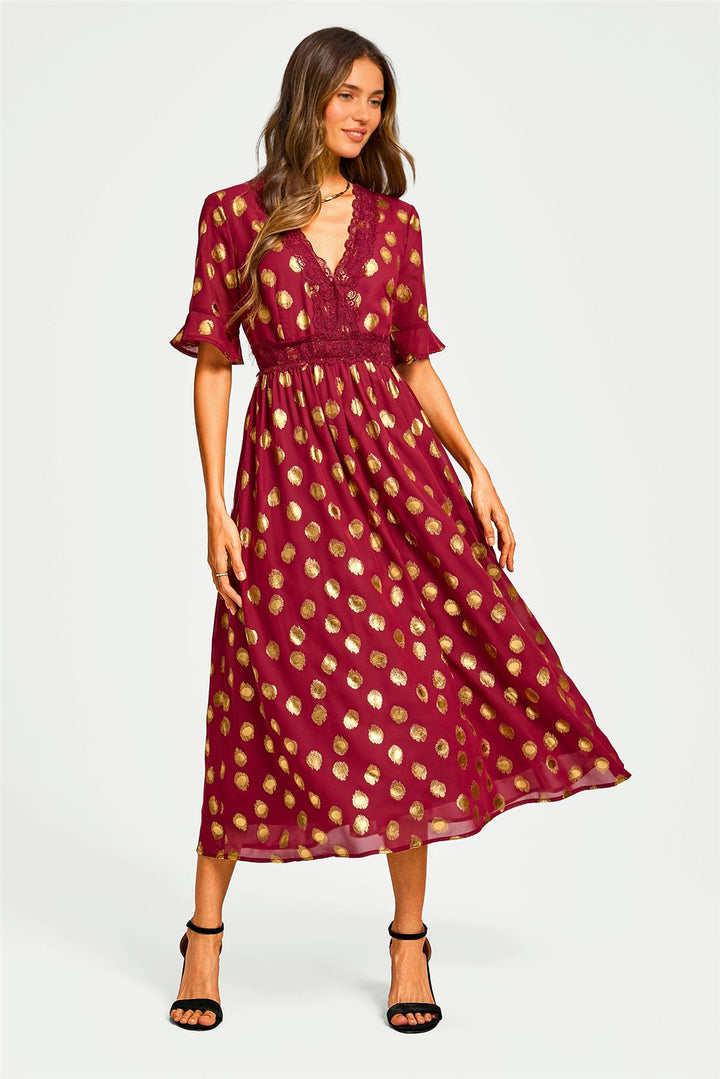 Gold Foil Long Sleeve Lace Trim V Neck Maxi Dress In Wine