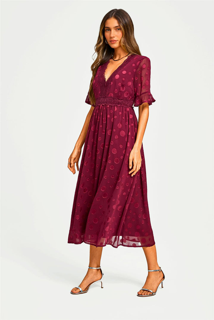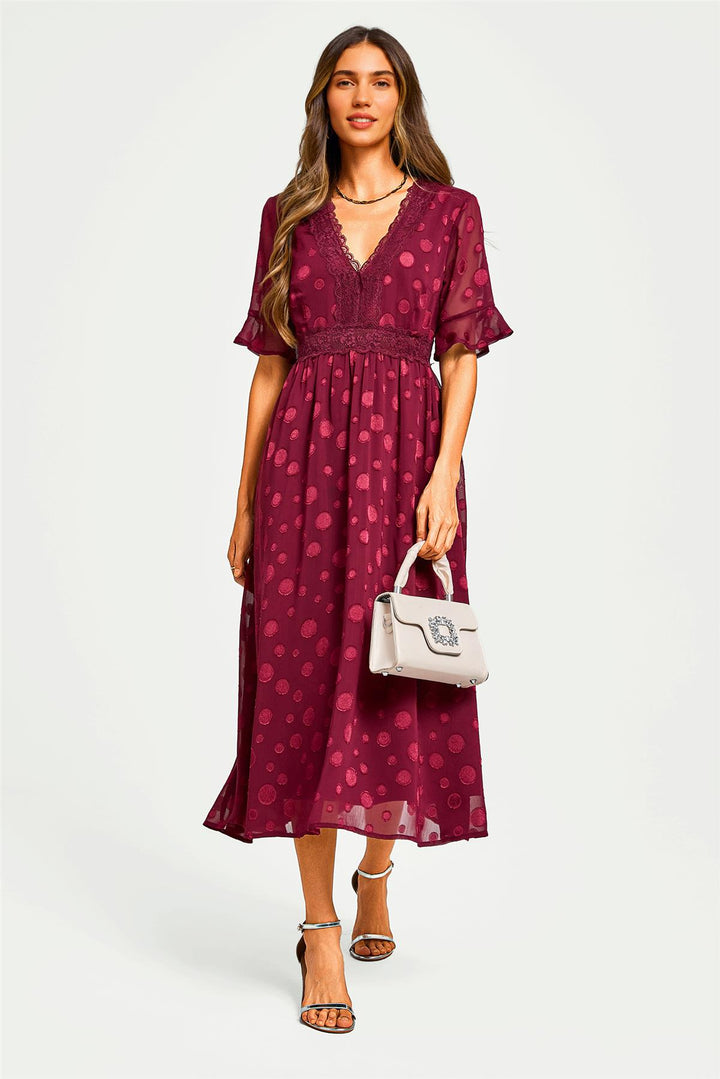 Add timeless elegance to your wardrobe with the Polka Dot Jacquard Long Sleeve Lace Trim V Neck Maxi Dress in Wine. Featuring a beautifully textured jacquard polka dot fabric, delicate lace trim, and a flattering V neckline, this maxi dress offers a perfect blend of sophistication and charm. Ideal for evening events, festive occasions, and special celebrations.
