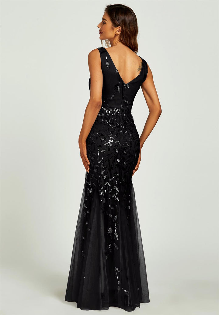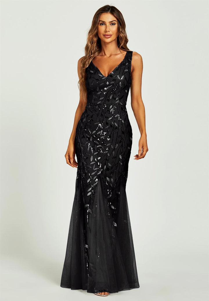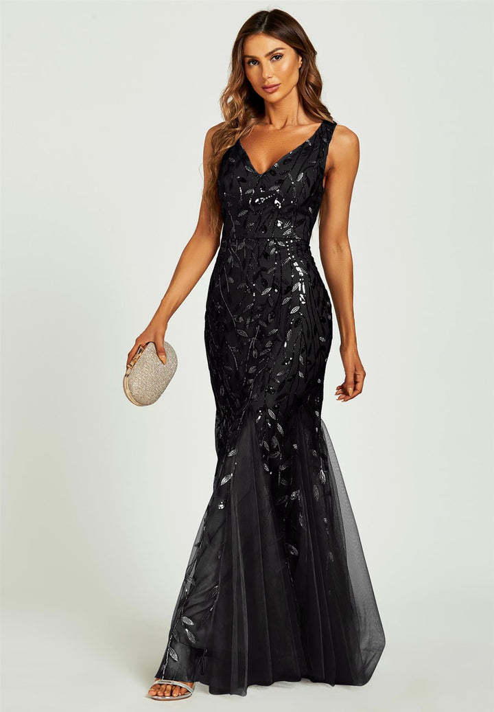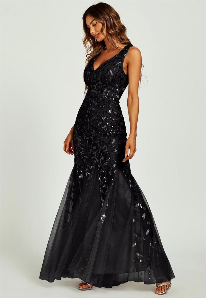 Sequin Leaf Detailed V Neck Bridesmaid Maxi Dress In Black